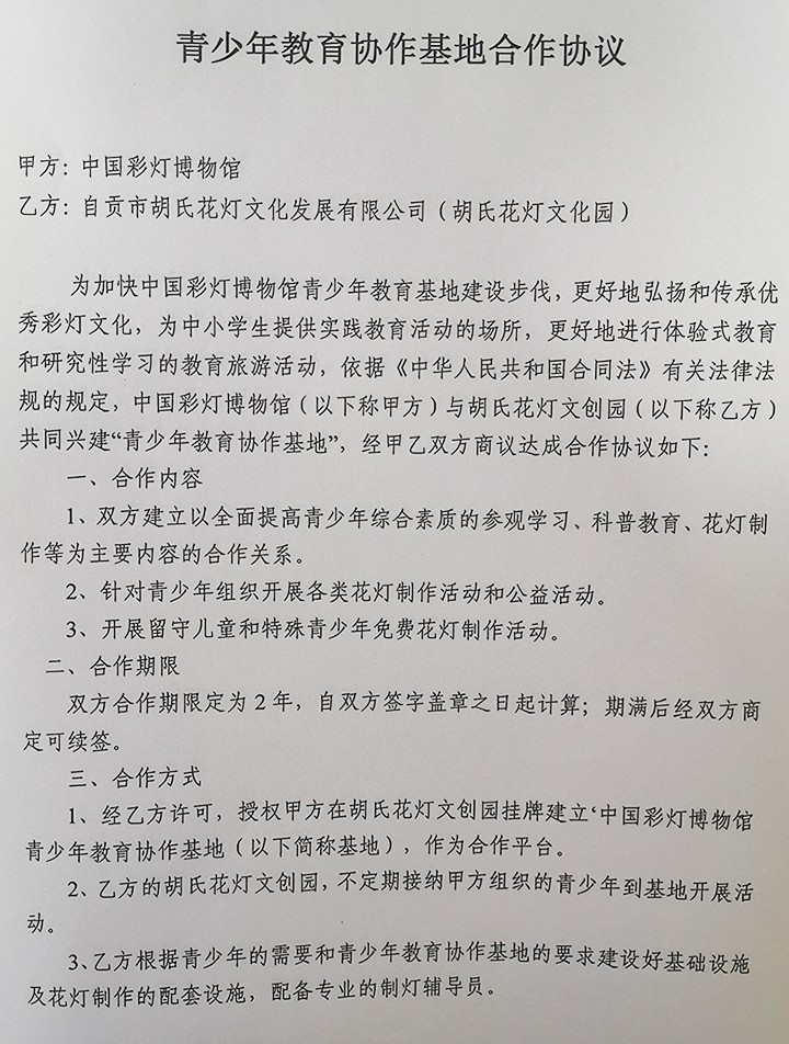 与自贡市胡氏花灯文化园签订青少年教育协作基地合作协议